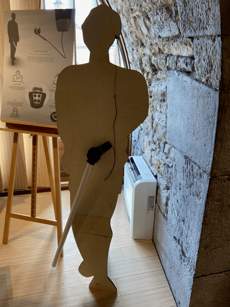 This project was born of a most interesting reflection on a Tuesday evening. It is the fruit of multi-disciplinary debates involving the humanities, technology and design. We were debating the question of relationships and interactions between individuals, in a world that no longer necessarily has the capacity to produce more. We therefore decided to work on an object, in a world that has become dependent on “screens”, that could enable us to communicate without necessarily needing to. To do this, we chose blind people as our reference population. Not all of them have the ability to use tactile interfaces, but they do need to. Following a survey, we identified the essential features of our smartphones. These functions have been condensed into a white cane handle, enabling visually impaired people to stay connected. This new tool will need to be easily reproducible, with a view to saving materials.