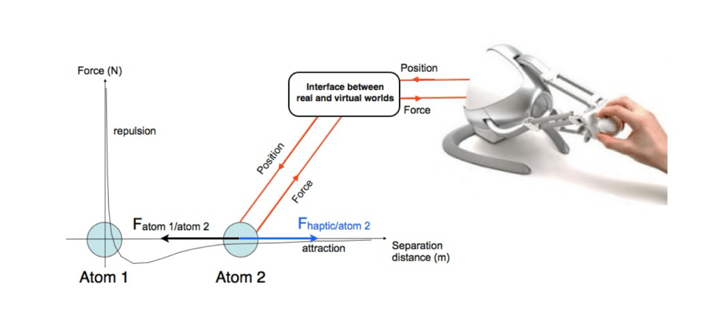 Thanks to this technologically enhanced perception, anyone can explore inaccessible aspects of reality such as the nanoworld. But who cares about perceiving forces. Certainly science teachers who design nanoscale instruction care, as well as gamers, especially the ones focused on serious games and interactive interfaces. Beside in the field of education, one teaches teenagers that are connected to multimedia in average 7 hours a day as recently reported [1]. This means intense exposition essentially through screens to a truncated representation of reality. Going beyond, combination of visual and force displays can provide our perception with an immediate and reliable access to essential scientific ideas. We shall now examine how this applies to atom interactions.