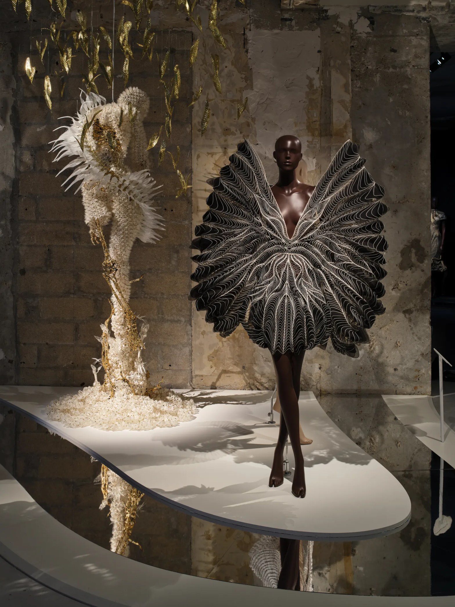 In the form of documentation, a very rich and diverse collection of pieces and samples is on display, highlighting materials and forms in all their diversity and sophistication. It is on this basis that Iris van Herpen can deploy all her references to living things, mushrooms, plankton, corals and jellyfish.
