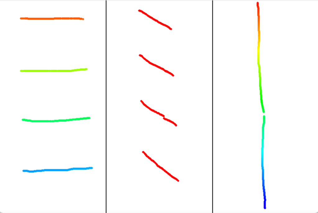 Red line is drawn by adding left and right trajectories. Red line is trajectory of center of mass of moving left point and moving right point.