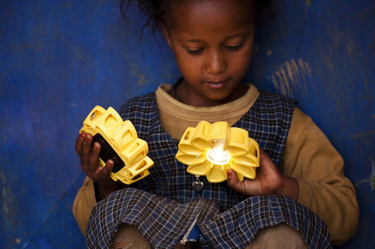 Un milliard de personnes sur terre n’utilisent pas d’interrupteurs. Pas d’électricité, pas d’interrupteur. Pas de lumière artificielle non plus alors que c’est souvent le soir que l’on étudie. Alors on s’éclaire en brûlant des dérivées du pétrole. Cher, polluant, mauvais pour la santé.