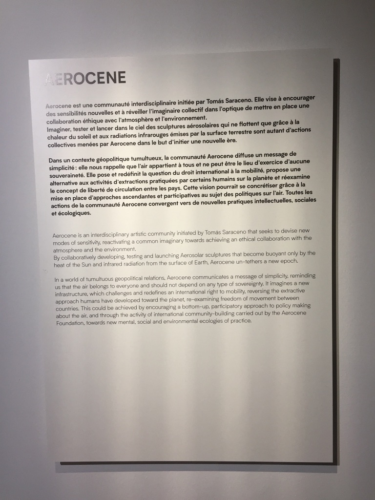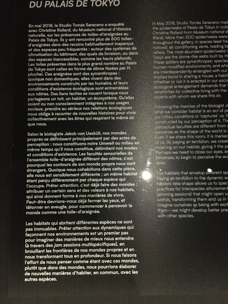” L’ASSEMBLAGE TOILE-D’ARAIGNÉE Depuis 2005′, Tomás Saraceno nous propose de changer de perspective, en racontant des histoires du point de vue de la toile de l’araignée. Repenser l’assemblage toile-d’araignée nous permet de prendre au sérieux son rôle d’extension matérielle des systèmes sensoriel et cognitif de l’araignée, dont elle est inséparable. Les collections muséologiques ont pourtant tendance à se concentrer sur l’araignée isolée de sa toile, plutôt que de suivre les fils de ces architectures matérielles qui connectent les toiles-d’araignées à leurs mondes, et qui sont les traces d’histoires complexes d’adaptation et d’évolution. Pour suivre ces histoires, et en collaboration avec des chercheurs et des institutions de divers champs disciplinaires, le Studio Tomás Saraceno s’applique à constituer une archive de toiles-d’araignées tri-dimensionnelles. C’est la seule . existante à ce jour, une ressource unique pour des recherches scientifiques aussi bien qu’artistiques, qui permet d’élaborer de nouveaux mades de classification, émergeant de la toile elle-même. Les toiles-d’araignées sont des architectures dynamiques, et non statiques — l’araignée ajuste, détruit et retisse sa toile en permanence, en particulier en réponse aux variations des conditions environnementales. Les toiles rencontrées en mai 2018 ne sont plus aujourd’hui nécessairement présentes dans les recoins signalés sur cette carte. Tout comme la toile-d’araignée, une carte n’est jamais permanente ou fixée, mais toujours susceptible d’évoluer : elle est avant tout une invitation à enquêter. En observant attentivement l’assemblage vivant et dynamique de toiles-d’araignées qui s’épanouissent juste au-dessus de vos têtes, vous découvrirez de nouvelles toiles, de nouveaux habitats et même sans doute de nouvelles espèces.” Copie de cartel de l’exposition