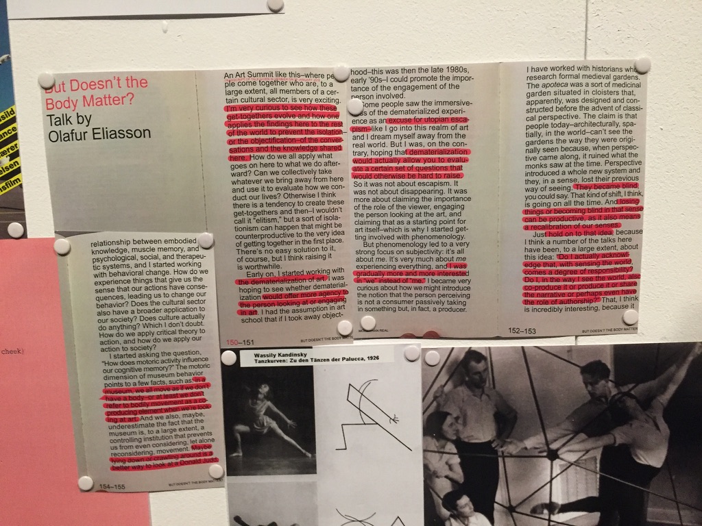 Finalement une immense frise montre la documentation détaillée de l’exposition « In real life » . Des dizaines de mètres carrés de textes, de notes manuscrites, de références, de photos du monde entier. Montrer ainsi la fabrication de l’exposition est une technique chère aux designers qui documentent tout. Et ils ont bien raison, parole de prof et de chercheur… On retrouve donc cette passion de la documentation bien sûr dans les écoles de Design mais aussi chez d’autres artistes-designers militants comme par exemple Tomas Saraceno. Son exposition “On Air” au Palais de Tokyo 2019 se terminait aussi par une grande frise. Magnifique. Et bien sûr un même discours militant. Il est d’ailleurs bien cité par Olafur Eliasson dans « In Real Life ». Les mêmes causes…