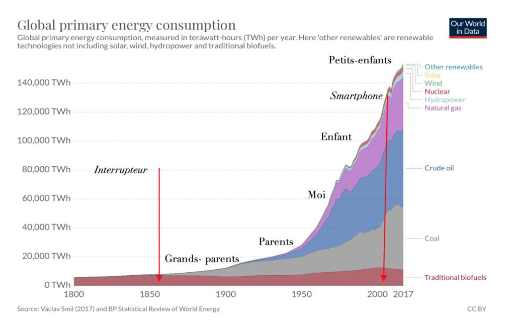 Cette courbe montre une augmentation incroyable de la consommation d’énergie de l’humanité depuis un siècle. Elle est devenue comparable à l’énergie solaire captée par photosynthèse. Les plantes, les arbres, le plancton, les algues… toute la planète verte. C’est un fait majeur dans l’histoire de l’humanité.